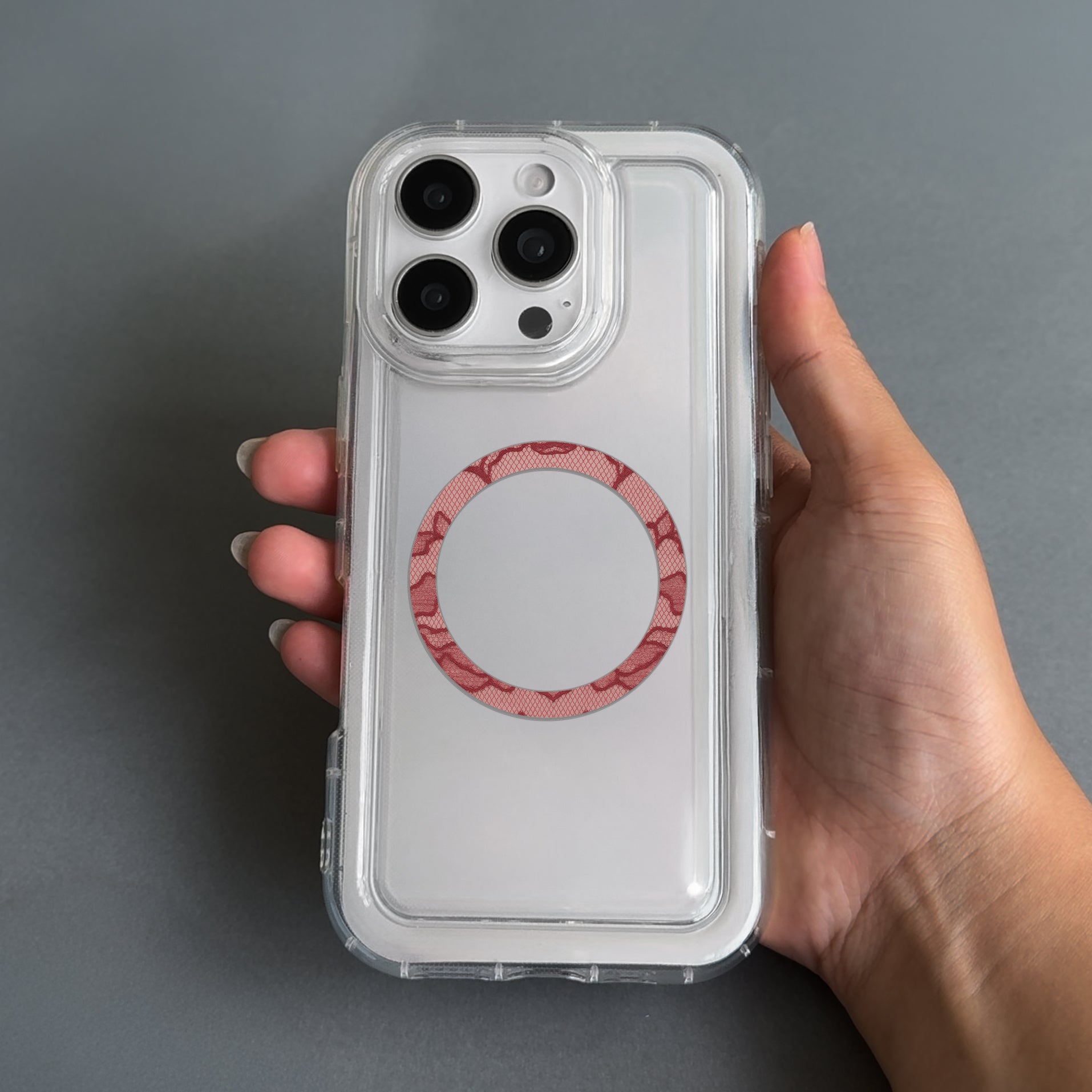 Peel the film protecting the adhesive, and stick to the OUTSIDE of the phone case, in the exact location of the magnetic ring inside your phone.