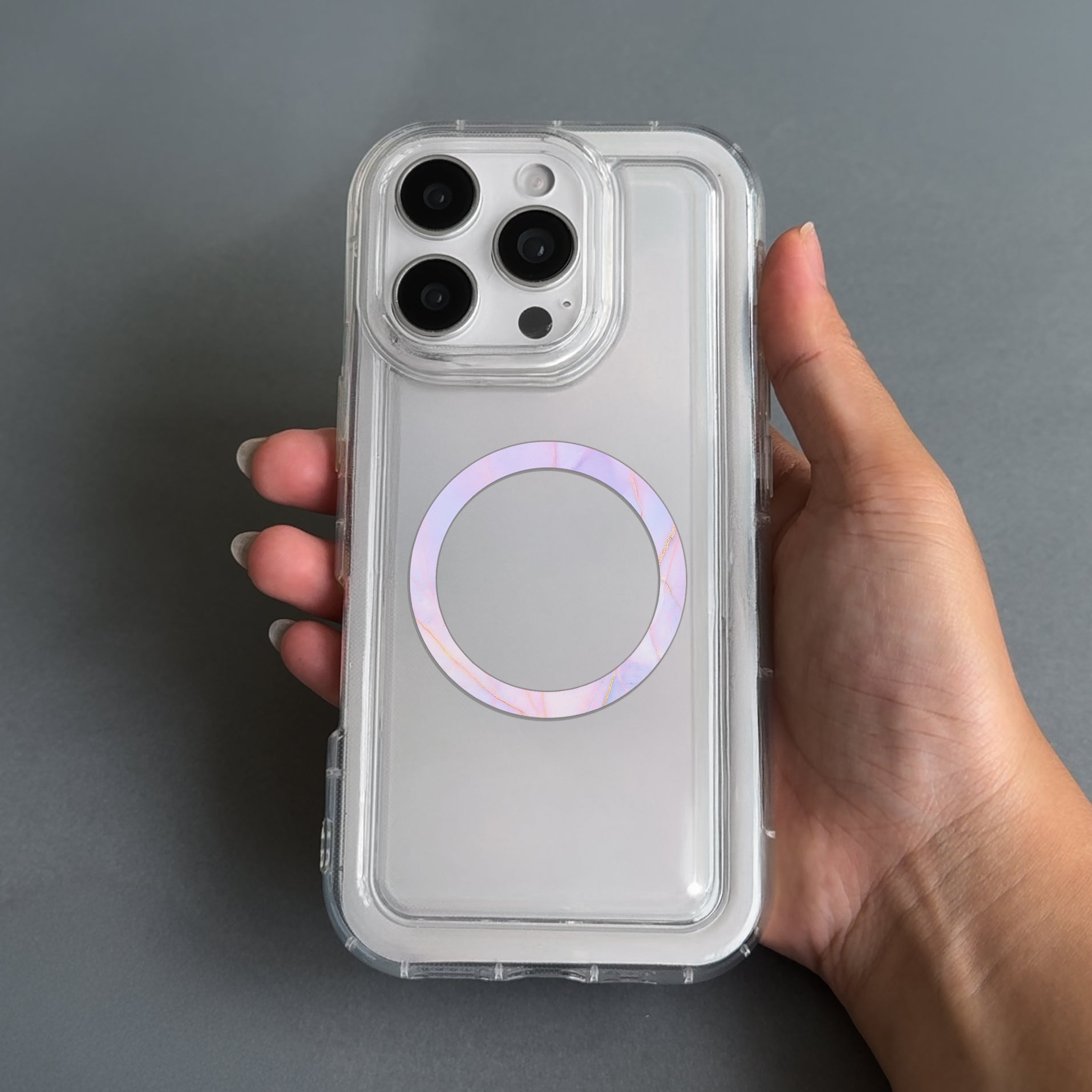 Peel the film protecting the adhesive, and stick to the OUTSIDE of the phone case, in the exact location of the magnetic ring inside your phone.